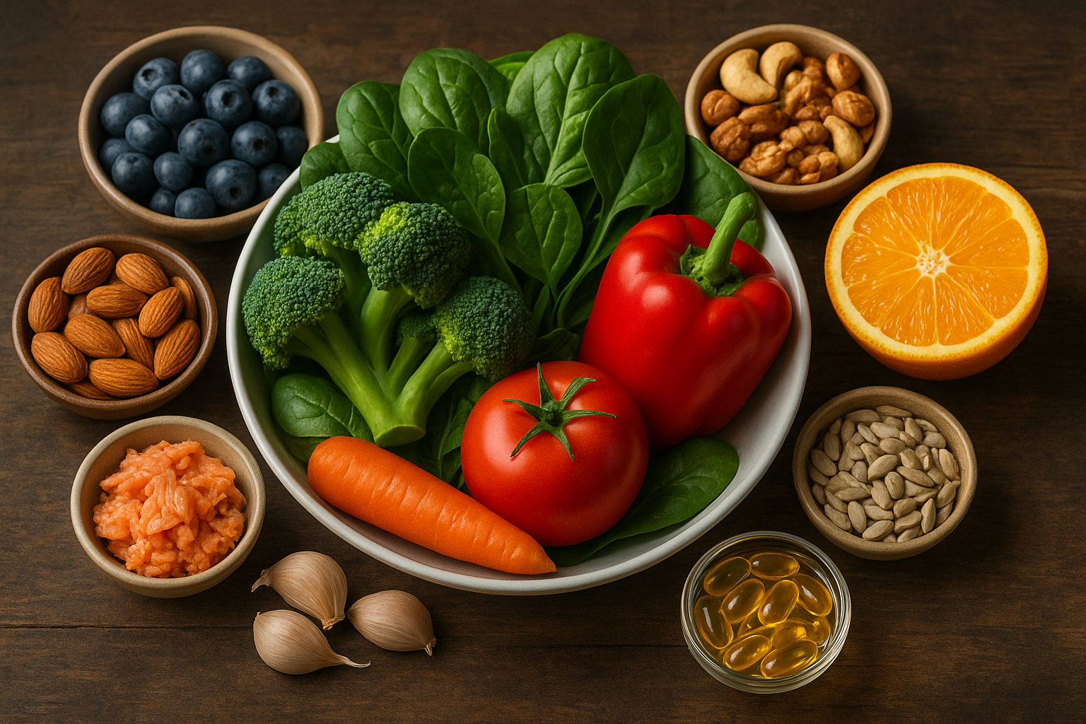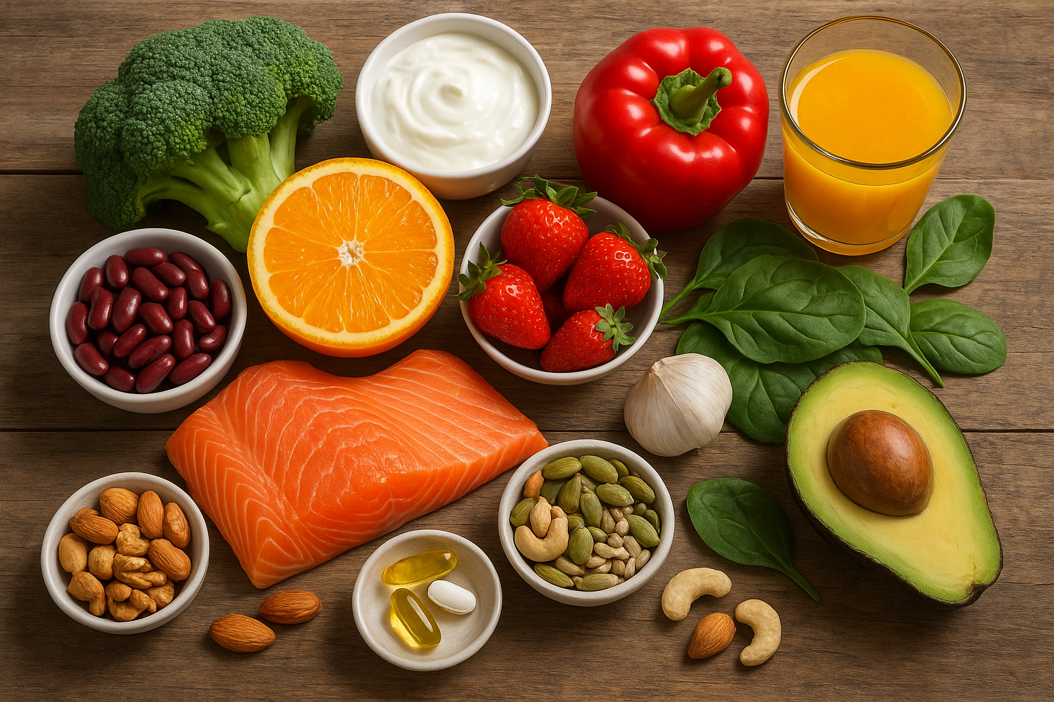 – Vitamin C: Supports immune cell function and antioxidant protection. Sources include citrus fruits (oranges, grapefruits, mandarins), berries, kiwi, bell peppers, broccoli, and leafy greens.