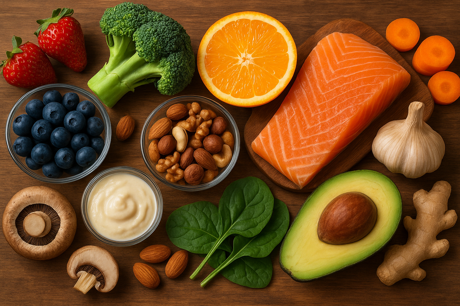 – Antioxidants and polyphenols: A colorful plate provides many of these compounds that help reduce oxidative stress and support immune cells. Fill your plate with a variety of fruits, vegetables, herbs (like turmeric and ginger), nuts, and whole grains.