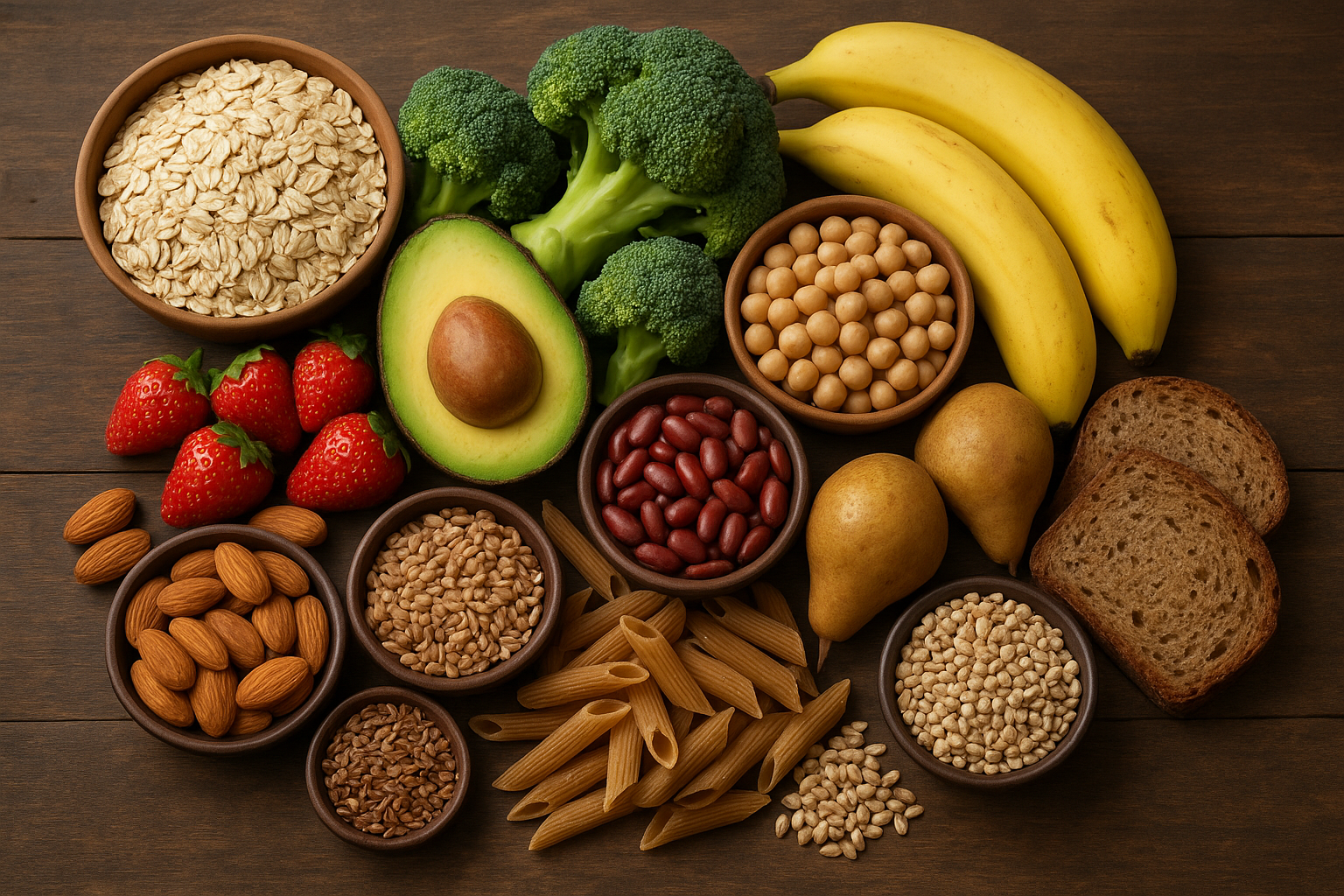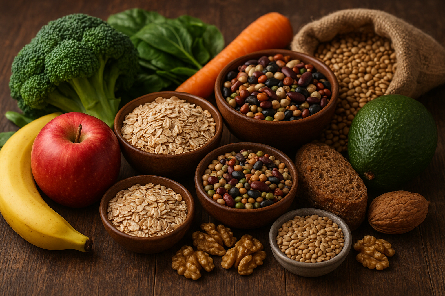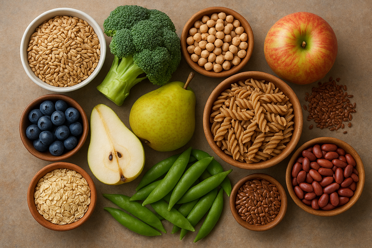 – Soluble fiber: Dissolves in water to form a gel-like substance. It slows digestion, helps control blood sugar levels, and can lower cholesterol. Sources include oats, barley, legumes (beans and lentils), apples, citrus fruits, carrots, and some seeds (like flax and chia).